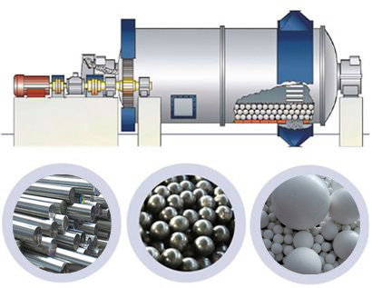 球磨机为卧式筒形旋转装置,外沿齿轮传动,两仓,格子型球磨机。物料由进料装置经入料中空轴螺旋均匀地进入磨机第一仓,该仓内有阶梯衬板或波纹衬板,内装不同规格钢球,筒体转动产生离心力将钢球带到一定高度后落下,对物料产生重击和研磨作用。物料在第一仓达到粗磨后,经单层隔仓板进入第二仓,该仓内镶有平衬板,内有钢球,将物料进一步研磨。粉状物通过卸料箅板排出,完成粉磨作业。